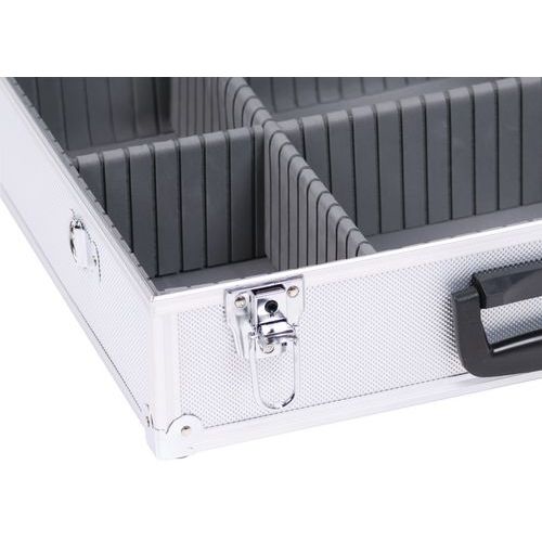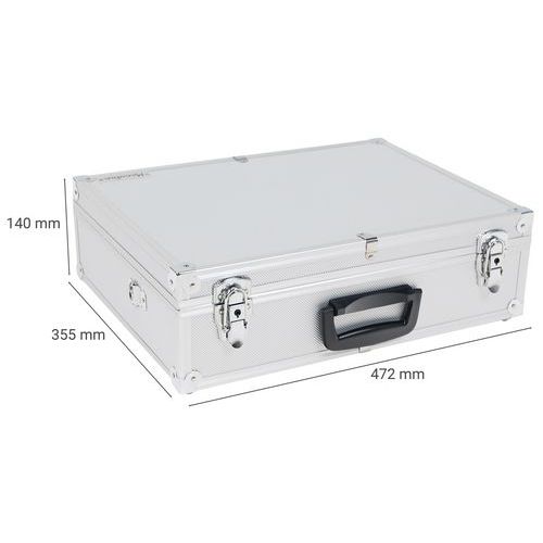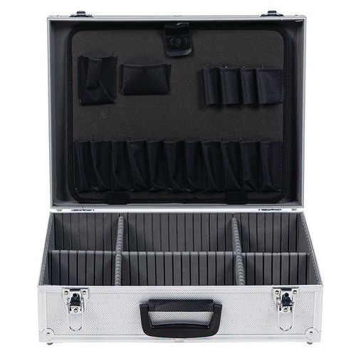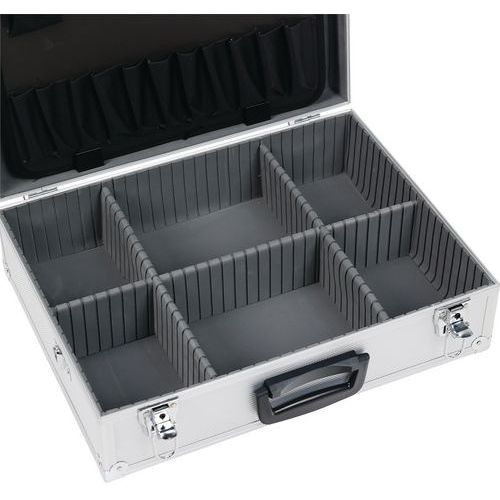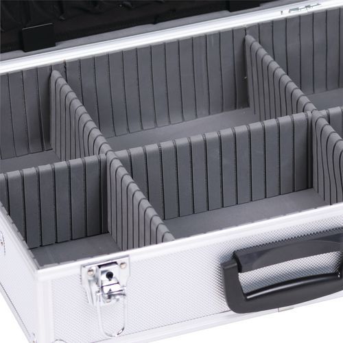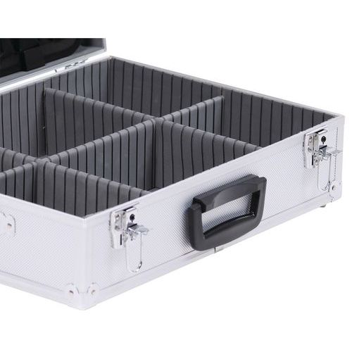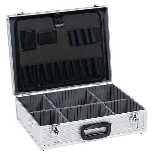 Műanyag szerszámtáska alapkivitelben. Fémkapcsokkal zárható. A tok a mellékelt kulcsokkal zárható. méretek h x b x t: 140 x 355 x 472 mm hasznos terület: 130 x 345 x 460 mm anyag: műanyag szín: ezüst súly: 3,8 kg max. terhelhetőség: 10 kg Gyártói garancia az ügyfélnek : 10 év