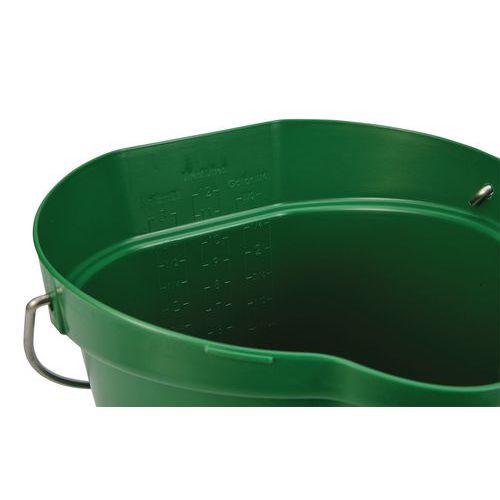 Vödör élelmezési célra. Osztályozott, ami megkönnyíti az összetevők kimérését. Literes mérleg. A kiöntőcső megakadályozza a kiömlést.