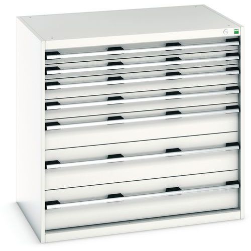 Bott Cubio fiókos szekrények 75 kg-os teherbírású, görgőscsapágyakon 100%-ban bővíthető fiókokkal. Magas hegesztett acélszerkezet, akár 1,5 tonna teherbírással, porszórt bevonattal. Központi zárrendszer és több nyitás blokkolása fiókok egyszerre. Ergonomikus fogantyúk feliratos szalaggal, zárás hengerzárral két kulccsal.