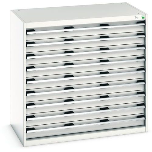 Bott Cubio fiókos szekrények 75 kg-os teherbírású, görgőscsapágyakon 100%-ban bővíthető fiókokkal. Magas hegesztett acélszerkezet, akár 1,5 tonna teherbírással, porszórt bevonattal. Központi zárrendszer és több nyitás blokkolása fiókok egyszerre. Ergonomikus fogantyúk feliratos szalaggal, zárás hengerzárral két kulccsal.