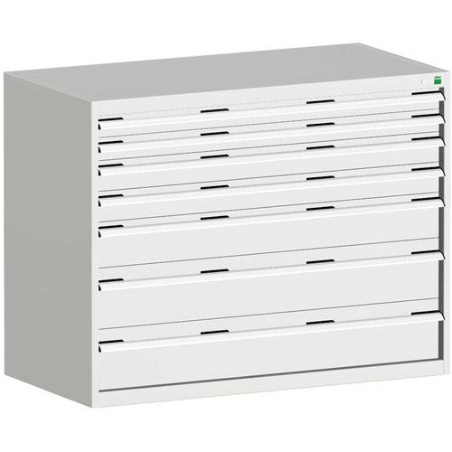 Bott Cubio fiókos szekrények 75 kg-os teherbírású, görgőscsapágyakon 100%-ban bővíthető fiókokkal. Magas hegesztett acélszerkezet, akár 1,5 tonna teherbírással, porszórt bevonattal. Központi zárrendszer és több nyitás blokkolása fiókok egyszerre. Ergonomikus fogantyúk feliratos szalaggal, zárás hengerzárral két kulccsal.