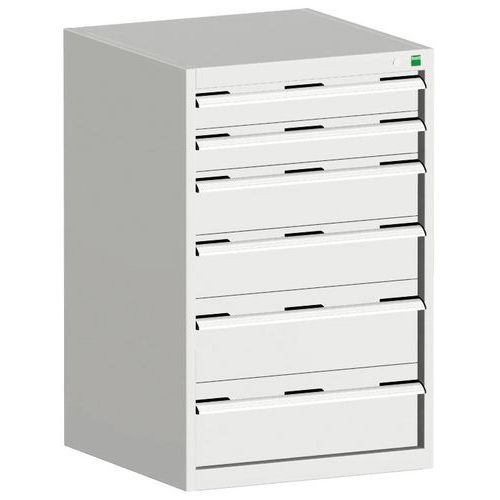Bott Cubio fiókos szekrények 75 kg-os teherbírású, görgőscsapágyakon 100%-ban bővíthető fiókokkal. Magas hegesztett acélszerkezet, akár 1,5 tonna teherbírással, porszórt bevonattal. Központi zárrendszer és több nyitás blokkolása fiókok egyszerre. Ergonomikus fogantyúk feliratos szalaggal, zárás hengerzárral két kulccsal.