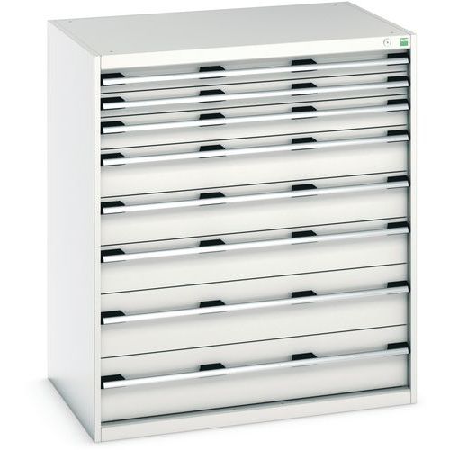 Bott Cubio fiókos szekrények 75 kg-os teherbírású, görgőscsapágyakon 100%-ban bővíthető fiókokkal. Magas hegesztett acélszerkezet, akár 1,5 tonna teherbírással, porszórt bevonattal. Központi zárrendszer és több nyitás blokkolása fiókok egyszerre. Ergonomikus fogantyúk feliratos szalaggal, zárás hengerzárral két kulccsal.