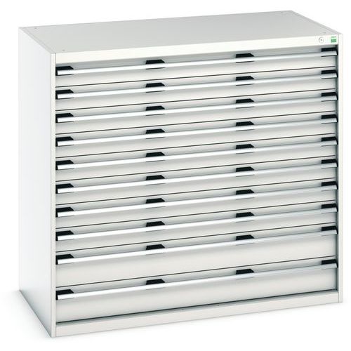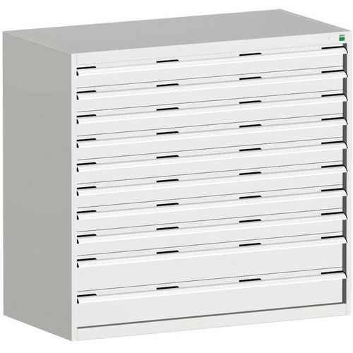 Bott Cubio fiókos szekrények 75 kg-os teherbírású, görgőscsapágyakon 100%-ban bővíthető fiókokkal. Magas hegesztett acélszerkezet, akár 1,5 tonna teherbírással, porszórt bevonattal. Központi zárrendszer és több nyitás blokkolása fiókok egyszerre. Ergonomikus fogantyúk feliratos szalaggal, zárás hengerzárral két kulccsal.