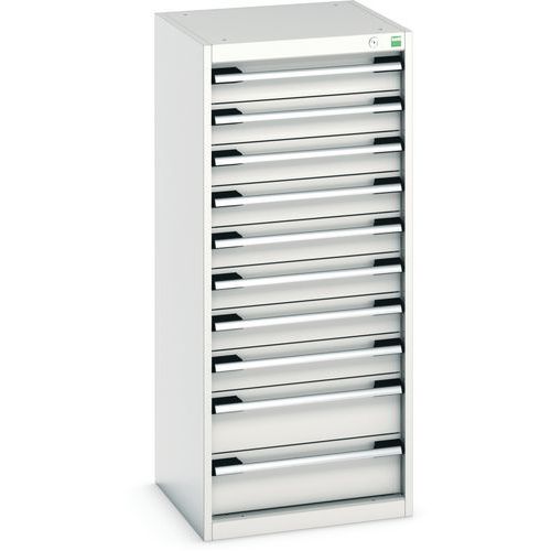 Bott Cubio fiókos szekrények 75 kg-os teherbírású, görgőscsapágyakon 100%-ban bővíthető fiókokkal. Magas hegesztett acélszerkezet, akár 1,5 tonna teherbírással, porszórt bevonattal. Központi zárrendszer és több nyitás blokkolása fiókok egyszerre. Ergonomikus fogantyúk feliratos szalaggal, zárás hengerzárral két kulccsal.