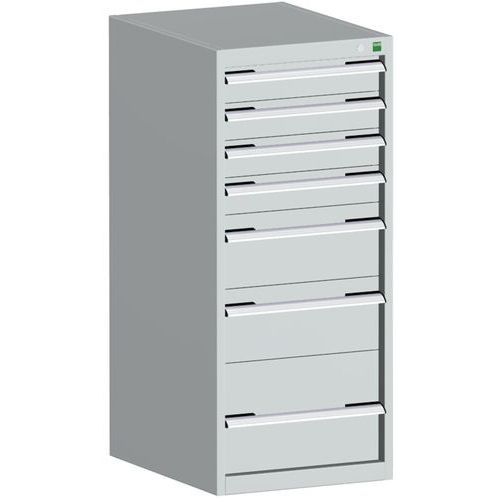 Bott Cubio fiókos szekrények 75 kg-os teherbírású, görgőscsapágyakon 100%-ban bővíthető fiókokkal. Magas hegesztett acélszerkezet, akár 1,5 tonna teherbírással, porszórt bevonattal. Központi zárrendszer és több nyitás blokkolása fiókok egyszerre. Ergonomikus fogantyúk feliratos szalaggal, zárás hengerzárral két kulccsal.