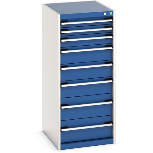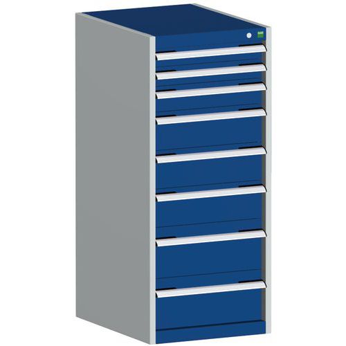 Bott Cubio fiókos szekrények 75 kg-os teherbírású, görgőscsapágyakon 100%-ban bővíthető fiókokkal. Magas hegesztett acélszerkezet, akár 1,5 tonna teherbírással, porszórt bevonattal. Központi zárrendszer és több nyitás blokkolása fiókok egyszerre. Ergonomikus fogantyúk feliratos szalaggal, zárás hengerzárral két kulccsal.