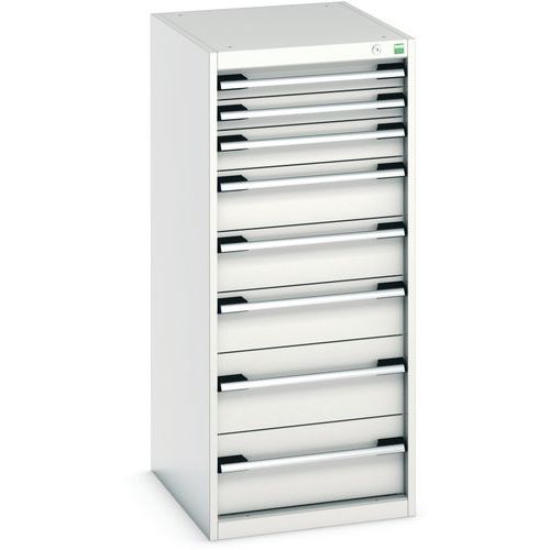 Bott Cubio fiókos szekrények 75 kg-os teherbírású, görgőscsapágyakon 100%-ban bővíthető fiókokkal. Magas hegesztett acélszerkezet, akár 1,5 tonna teherbírással, porszórt bevonattal. Központi zárrendszer és több nyitás blokkolása fiókok egyszerre. Ergonomikus fogantyúk feliratos szalaggal, zárás hengerzárral két kulccsal.