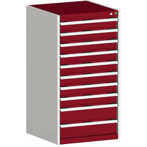 Bott Cubio fiókos szekrények 75 kg-os teherbírású, görgőscsapágyakon 100%-ban bővíthető fiókokkal. Magas hegesztett acélszerkezet, akár 1,5 tonna teherbírással, porszórt bevonattal. Központi zárrendszer és több nyitás blokkolása fiókok egyszerre. Ergonomikus fogantyúk feliratos szalaggal, zárás hengerzárral két kulccsal.