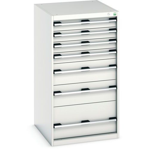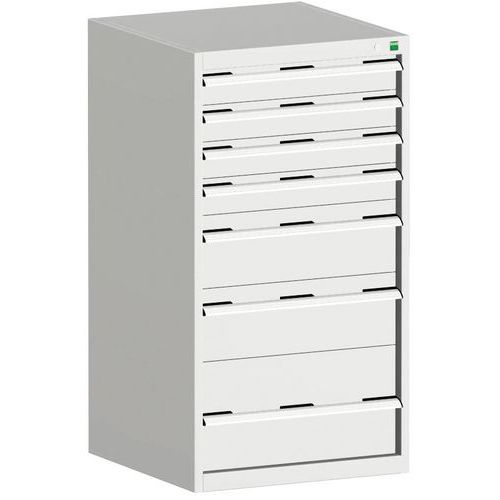 Bott Cubio fiókos szekrények 75 kg-os teherbírású, görgőscsapágyakon 100%-ban bővíthető fiókokkal. Magas hegesztett acélszerkezet, akár 1,5 tonna teherbírással, porszórt bevonattal. Központi zárrendszer és több nyitás blokkolása fiókok egyszerre. Ergonomikus fogantyúk feliratos szalaggal, zárás hengerzárral két kulccsal.