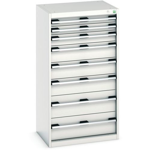 Bott Cubio fiókos szekrények 75 kg-os teherbírású, görgőscsapágyakon 100%-ban bővíthető fiókokkal. Magas hegesztett acélszerkezet, akár 1,5 tonna teherbírással, porszórt bevonattal. Központi zárrendszer és több nyitás blokkolása fiókok egyszerre. Ergonomikus fogantyúk feliratos szalaggal, zárás hengerzárral két kulccsal.