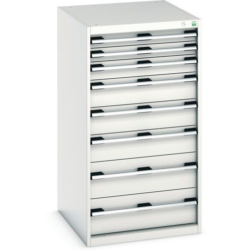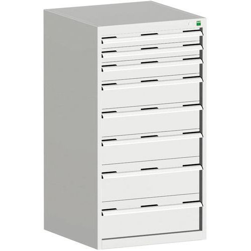 Bott Cubio fiókos szekrények 75 kg-os teherbírású, görgőscsapágyakon 100%-ban bővíthető fiókokkal. Magas hegesztett acélszerkezet, akár 1,5 tonna teherbírással, porszórt bevonattal. Központi zárrendszer és több nyitás blokkolása fiókok egyszerre. Ergonomikus fogantyúk feliratos szalaggal, zárás hengerzárral két kulccsal.