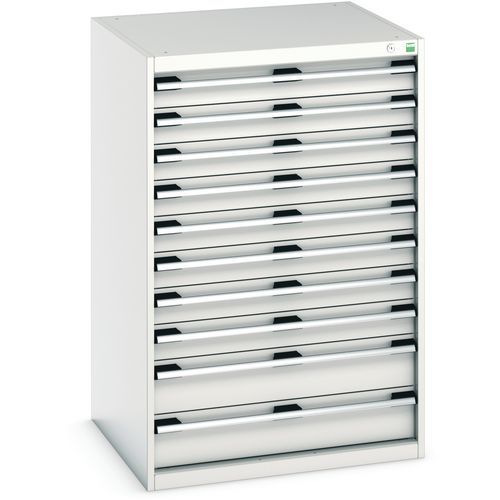 Bott Cubio fiókos szekrények 75 kg-os teherbírású, görgőscsapágyakon 100%-ban bővíthető fiókokkal. Magas hegesztett acélszerkezet, akár 1,5 tonna teherbírással, porszórt bevonattal. Központi zárrendszer és több nyitás blokkolása fiókok egyszerre. Ergonomikus fogantyúk feliratos szalaggal, zárás hengerzárral két kulccsal.