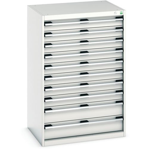 Bott Cubio fiókos szekrények 75 kg-os teherbírású, görgőscsapágyakon 100%-ban bővíthető fiókokkal. Magas hegesztett acélszerkezet, akár 1,5 tonna teherbírással, porszórt bevonattal. Központi zárrendszer és több nyitás blokkolása fiókok egyszerre. Ergonomikus fogantyúk feliratos szalaggal, zárás hengerzárral két kulccsal.