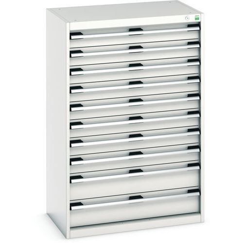 Bott Cubio fiókos szekrények 75 kg-os teherbírású, görgőscsapágyakon 100%-ban bővíthető fiókokkal. Magas hegesztett acélszerkezet, akár 1,5 tonna teherbírással, porszórt bevonattal. Központi zárrendszer és több nyitás blokkolása fiókok egyszerre. Ergonomikus fogantyúk feliratos szalaggal, zárás hengerzárral két kulccsal.