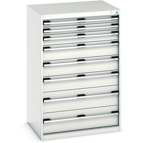 Bott Cubio fiókos szekrények 75 kg-os teherbírású, görgőscsapágyakon 100%-ban bővíthető fiókokkal. Magas hegesztett acélszerkezet, akár 1,5 tonna teherbírással, porszórt bevonattal. Központi zárrendszer és több nyitás blokkolása fiókok egyszerre. Ergonomikus fogantyúk feliratos szalaggal, zárás hengerzárral két kulccsal.
