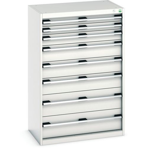 Bott Cubio fiókos szekrények 75 kg-os teherbírású, görgőscsapágyakon 100%-ban bővíthető fiókokkal. Magas hegesztett acélszerkezet, akár 1,5 tonna teherbírással, porszórt bevonattal. Központi zárrendszer és több nyitás blokkolása fiókok egyszerre. Ergonomikus fogantyúk feliratos szalaggal, zárás hengerzárral két kulccsal.
