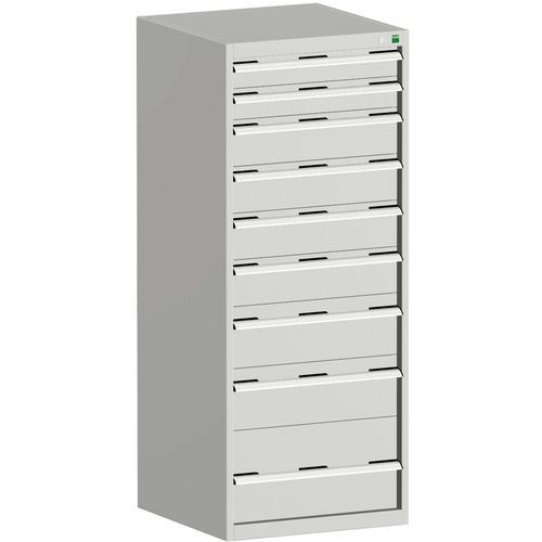 Bott Cubio fiókos szekrények 75 kg-os teherbírású, görgőscsapágyakon 100%-ban bővíthető fiókokkal. Magas hegesztett acélszerkezet, akár 1,5 tonna teherbírással, porszórt bevonattal. Központi zárrendszer és több nyitás blokkolása fiókok egyszerre. Ergonomikus fogantyúk feliratos szalaggal, zárás hengerzárral két kulccsal.
