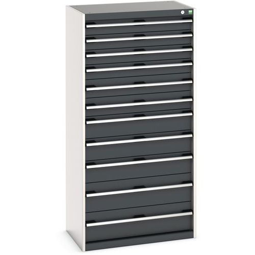 Bott Cubio fiókos szekrények 75 kg-os teherbírású, görgőscsapágyakon 100%-ban bővíthető fiókokkal. Magas hegesztett acélszerkezet, akár 1,5 tonna teherbírással, porszórt bevonattal. Központi zárrendszer és több nyitás blokkolása fiókok egyszerre. Ergonomikus fogantyúk feliratos szalaggal, zárás hengerzárral két kulccsal.