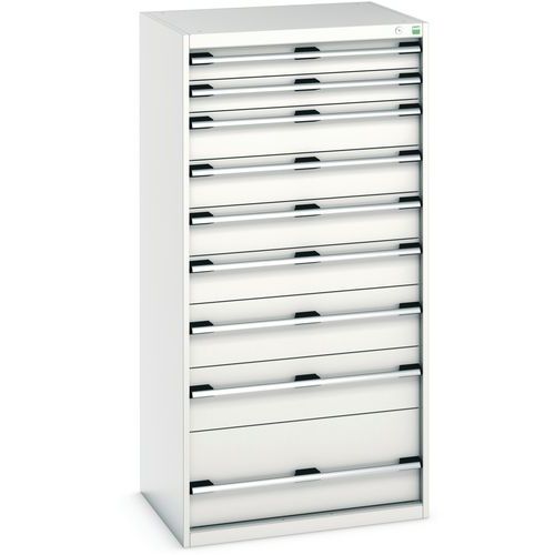 Bott Cubio fiókos szekrények 75 kg-os teherbírású, görgőscsapágyakon 100%-ban bővíthető fiókokkal. Magas hegesztett acélszerkezet, akár 1,5 tonna teherbírással, porszórt bevonattal. Központi zárrendszer és több nyitás blokkolása fiókok egyszerre. Ergonomikus fogantyúk feliratos szalaggal, zárás hengerzárral két kulccsal.