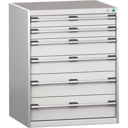 Bott Cubio fiókos szekrények 200 kg teherbírású fiókokkal és 100%-ban görgős csapágyakkal bővíthető. Magas hegesztett acél konstrukció 1,5 tonna teherbírásig, porszórt bevonattal. Központi zárrendszer és több nyitás blokkolása fiókok egyszerre. Ergonomikus fogantyúk feliratos szalaggal, zárás hengerzárral két kulccsal.