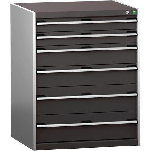 Bott Cubio fiókos szekrények 200 kg teherbírású fiókokkal és 100%-ban görgős csapágyakkal bővíthető. Magas hegesztett acél konstrukció 1,5 tonna teherbírásig, porszórt bevonattal. Központi zárrendszer és több nyitás blokkolása fiókok egyszerre. Ergonomikus fogantyúk feliratos szalaggal, zárás hengerzárral két kulccsal.