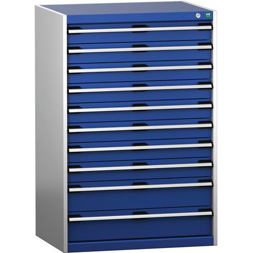 Bott Cubio fiókos szekrények 200 kg teherbírású fiókokkal és 100%-ban görgős csapágyakkal bővíthető. Magas hegesztett acél konstrukció 1,5 tonna teherbírásig, porszórt bevonattal. Központi zárrendszer és több nyitás blokkolása fiókok egyszerre. Ergonomikus fogantyúk feliratos szalaggal, zárás hengerzárral két kulccsal.