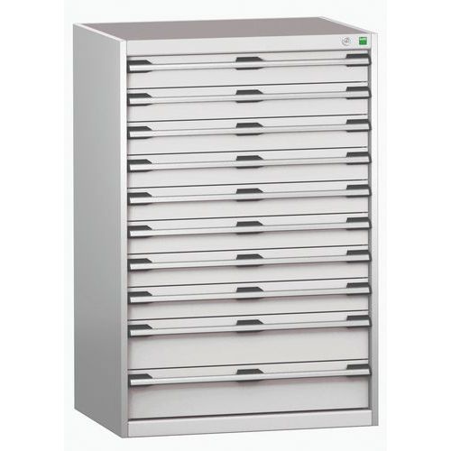 Bott Cubio fiókos szekrények 200 kg teherbírású fiókokkal és 100%-ban görgős csapágyakkal bővíthető. Magas hegesztett acél konstrukció 1,5 tonna teherbírásig, porszórt bevonattal. Központi zárrendszer és több nyitás blokkolása fiókok egyszerre. Ergonomikus fogantyúk feliratos szalaggal, zárás hengerzárral két kulccsal.