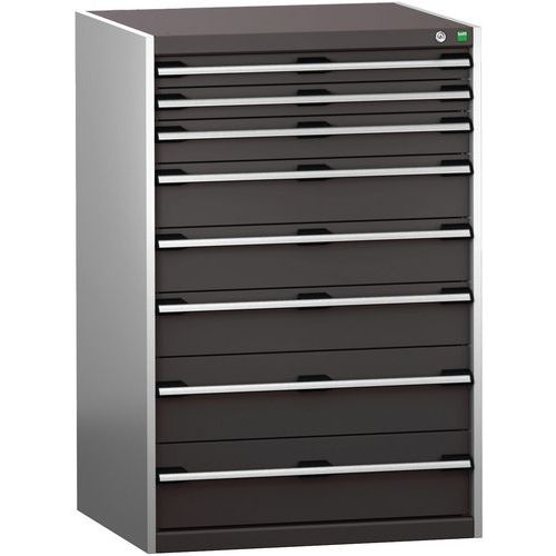 Bott Cubio fiókos szekrények 200 kg teherbírású fiókokkal és 100%-ban görgős csapágyakkal bővíthető. Magas hegesztett acél konstrukció 1,5 tonna teherbírásig, porszórt bevonattal. Központi zárrendszer és több nyitás blokkolása fiókok egyszerre. Ergonomikus fogantyúk feliratos szalaggal, zárás hengerzárral két kulccsal.