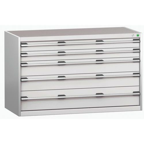 Bott Cubio fiókos szekrények 200 kg teherbírású fiókokkal és 100%-ban görgős csapágyakkal bővíthető. Magas hegesztett acél konstrukció 1,5 tonna teherbírásig, porszórt bevonattal. Központi zárrendszer és több nyitás blokkolása fiókok egyszerre. Ergonomikus fogantyúk feliratos szalaggal, zárás hengerzárral két kulccsal.