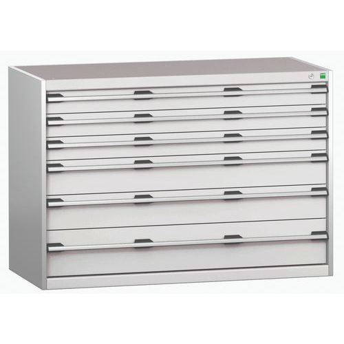 Bott Cubio fiókos szekrények 200 kg teherbírású fiókokkal és 100%-ban görgős csapágyakkal bővíthető. Magas hegesztett acél konstrukció 1,5 tonna teherbírásig, porszórt bevonattal. Központi zárrendszer és több nyitás blokkolása fiókok egyszerre. Ergonomikus fogantyúk feliratos szalaggal, zárás hengerzárral két kulccsal.