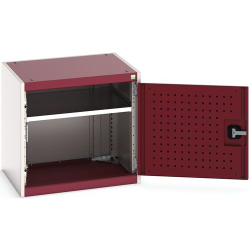 Bott Cubio fiókos szekrények horganyzott polccal, 100 kg teherbírással. Szekrényajtó perforált belső oldallal a szerszámok tárolására. Magas hegesztett acél konstrukció 1,5 tonna teherbírással, porszórt kivitelben. Zárás egy hengerzár két kulccsal.