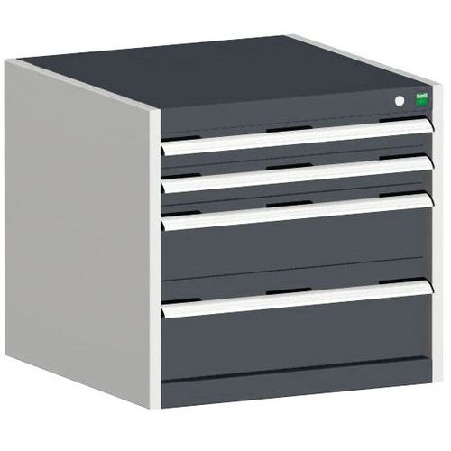Bott Cubio fiókos szekrények 75 kg-os teherbírású, görgőscsapágyakon 100%-ban bővíthető fiókokkal. Magas hegesztett acélszerkezet, akár 1,5 tonna teherbírással, porszórt bevonattal. Központi zárrendszer és több nyitás blokkolása fiókok egyszerre. Ergonomikus fogantyúk feliratos szalaggal, zárás hengerzárral két kulccsal.