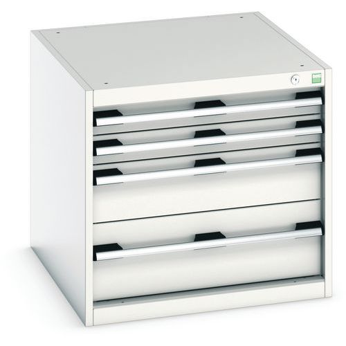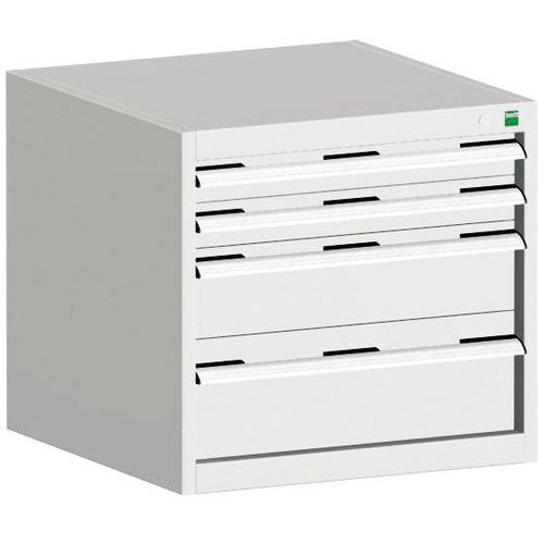 Bott Cubio fiókos szekrények 75 kg-os teherbírású, görgőscsapágyakon 100%-ban bővíthető fiókokkal. Magas hegesztett acélszerkezet, akár 1,5 tonna teherbírással, porszórt bevonattal. Központi zárrendszer és több nyitás blokkolása fiókok egyszerre. Ergonomikus fogantyúk feliratos szalaggal, zárás hengerzárral két kulccsal.
