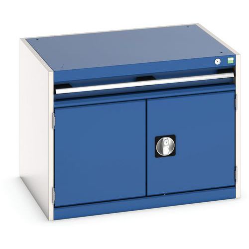Bott Cubio fiókos szekrények 75 kg-os teherbírású és 100%-os görgőscsapágyakkal bővíthető fiókokkal. Szekrényajtó perforált belső oldallal a szerszámok tárolására. Magas hegesztett acél konstrukció akár 1,5 tonna teherbírással, porszórt bevonattal befejezni. Központi zárrendszerű zár és egyidejűleg több fiók nyitásának blokkolása. Ergonomikus fogantyúk írható csíkkal, zárás hengeres zárral, két kulccsal.