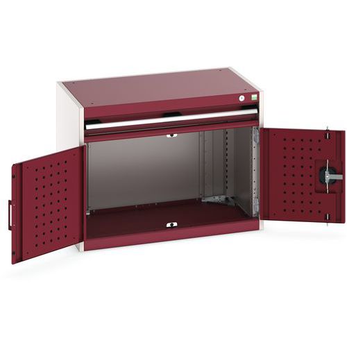 Bott Cubio fiókos szekrények 75 kg-os teherbírású és 100%-os görgőscsapágyakkal bővíthető fiókokkal. Szekrényajtó perforált belső oldallal a szerszámok tárolására. Magas hegesztett acél konstrukció akár 1,5 tonna teherbírással, porszórt bevonattal befejezni. Központi zárrendszerű zár és egyidejűleg több fiók nyitásának blokkolása. Ergonomikus fogantyúk írható csíkkal, zárás hengeres zárral, két kulccsal.