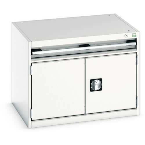 Bott Cubio fiókos szekrények 75 kg-os teherbírású és 100%-os görgőscsapágyakkal bővíthető fiókokkal. Szekrényajtó perforált belső oldallal a szerszámok tárolására. Magas hegesztett acél konstrukció akár 1,5 tonna teherbírással, porszórt bevonattal befejezni. Központi zárrendszerű zár és egyidejűleg több fiók nyitásának blokkolása. Ergonomikus fogantyúk írható csíkkal, zárás hengeres zárral, két kulccsal.