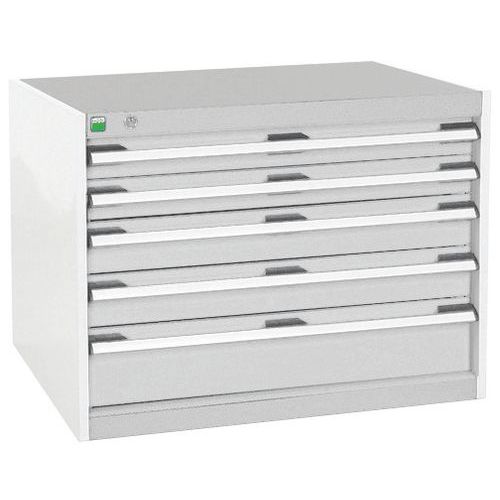 Bott Cubio fiókos szekrények 75 kg-os teherbírású, görgőscsapágyakon 100%-ban bővíthető fiókokkal. Magas hegesztett acélszerkezet, akár 1,5 tonna teherbírással, porszórt bevonattal. Központi zárrendszer és több nyitás blokkolása fiókok egyszerre. Ergonomikus fogantyúk feliratos szalaggal, zárás hengerzárral két kulccsal.