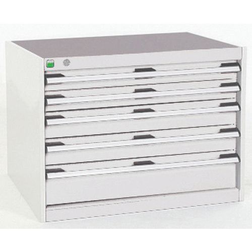 Bott Cubio fiókos szekrények 75 kg-os teherbírású, görgőscsapágyakon 100%-ban bővíthető fiókokkal. Magas hegesztett acélszerkezet, akár 1,5 tonna teherbírással, porszórt bevonattal. Központi zárrendszer és több nyitás blokkolása fiókok egyszerre. Ergonomikus fogantyúk feliratos szalaggal, zárás hengerzárral két kulccsal.