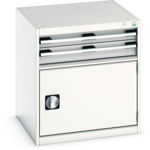 Bott Cubio fiókos szekrények 75 kg-os teherbírású és 100%-os görgőscsapágyakkal bővíthető fiókokkal. Szekrényajtó perforált belső oldallal a szerszámok tárolására. Magas hegesztett acél konstrukció akár 1,5 tonna teherbírással, porszórt bevonattal befejezni. Központi zárrendszerű zár és egyidejűleg több fiók nyitásának blokkolása. Ergonomikus fogantyúk írható csíkkal, zárás hengeres zárral, két kulccsal.