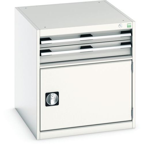 Bott Cubio fiókos szekrények 75 kg-os teherbírású és 100%-os görgőscsapágyakkal bővíthető fiókokkal. Szekrényajtó perforált belső oldallal a szerszámok tárolására. Magas hegesztett acél konstrukció akár 1,5 tonna teherbírással, porszórt bevonattal befejezni. Központi zárrendszerű zár és egyidejűleg több fiók nyitásának blokkolása. Ergonomikus fogantyúk írható csíkkal, zárás hengeres zárral, két kulccsal.