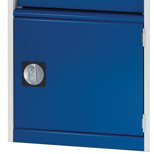 Bott Cubio fiókos szekrények 75 kg-os teherbírású és 100%-os görgőscsapágyakkal bővíthető fiókokkal. Szekrényajtó perforált belső oldallal a szerszámok tárolására. Magas hegesztett acél konstrukció akár 1,5 tonna teherbírással, porszórt bevonattal befejezni. Központi zárrendszerű zár és egyidejűleg több fiók nyitásának blokkolása. Ergonomikus fogantyúk írható csíkkal, zárás hengeres zárral, két kulccsal.