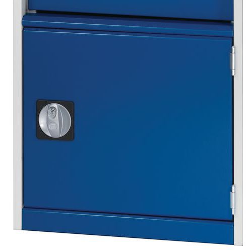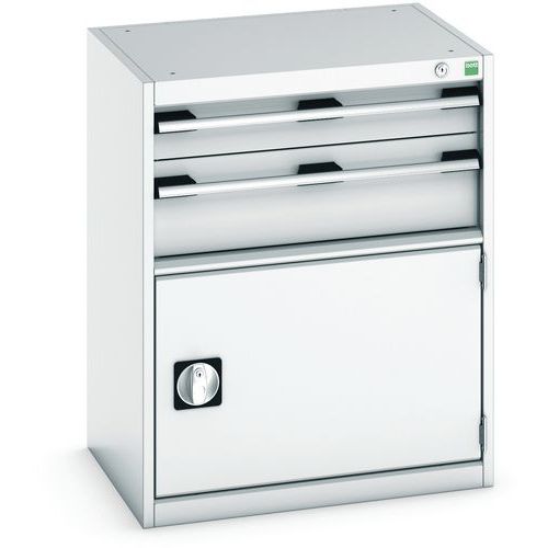 Bott Cubio fiókos szekrények 75 kg-os teherbírású és 100%-os görgőscsapágyakkal bővíthető fiókokkal. Szekrényajtó perforált belső oldallal a szerszámok tárolására. Magas hegesztett acél konstrukció akár 1,5 tonna teherbírással, porszórt bevonattal befejezni. Központi zárrendszerű zár és egyidejűleg több fiók nyitásának blokkolása. Ergonomikus fogantyúk írható csíkkal, zárás hengeres zárral, két kulccsal.