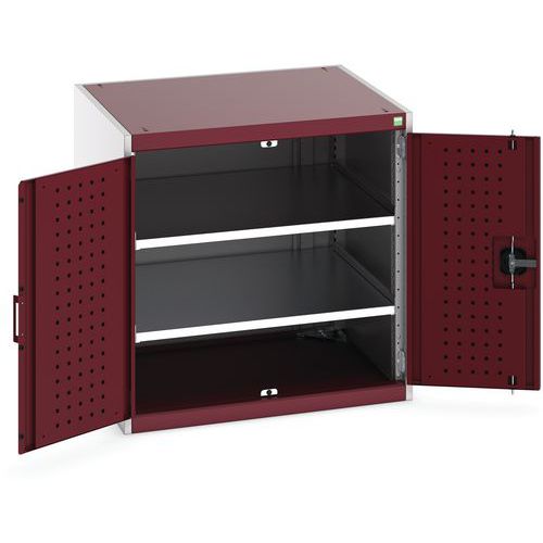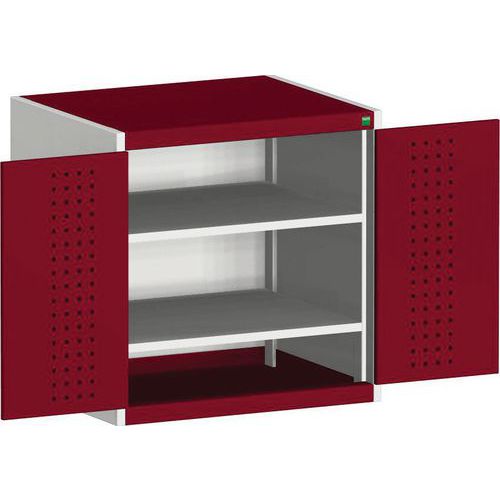 Bott Cubio fiókos szekrények horganyzott polccal, 100 kg teherbírással. Szekrényajtó perforált belső oldallal a szerszámok tárolására. Magas hegesztett acél konstrukció 1,5 tonna teherbírással, porszórt kivitelben. Zárás egy hengerzár két kulccsal.