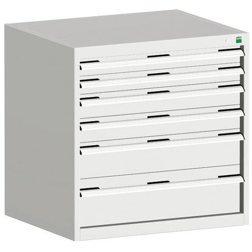 Bott Cubio fiókos szekrények 75 kg-os teherbírású, görgőscsapágyakon 100%-ban bővíthető fiókokkal. Magas hegesztett acélszerkezet, akár 1,5 tonna teherbírással, porszórt bevonattal. Központi zárrendszer és több nyitás blokkolása fiókok egyszerre. Ergonomikus fogantyúk feliratos szalaggal, zárás hengerzárral két kulccsal.