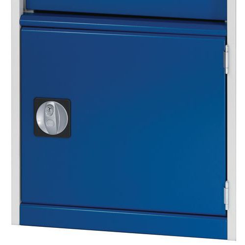 Bott Cubio fiókos szekrények 75 kg-os teherbírású és 100%-os görgőscsapágyakkal bővíthető fiókokkal. Szekrényajtó perforált belső oldallal a szerszámok tárolására. Magas hegesztett acél konstrukció akár 1,5 tonna teherbírással, porszórt bevonattal befejezni. Központi zárrendszerű zár és egyidejűleg több fiók nyitásának blokkolása. Ergonomikus fogantyúk írható csíkkal, zárás hengeres zárral, két kulccsal.