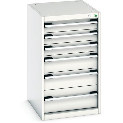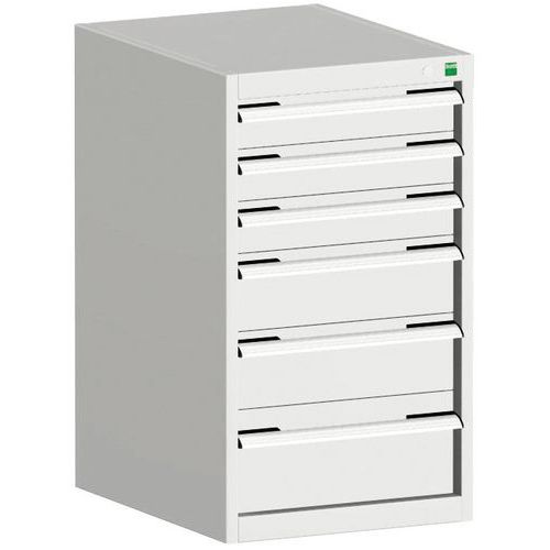 Bott Cubio fiókos szekrények 75 kg-os teherbírású, görgőscsapágyakon 100%-ban bővíthető fiókokkal. Magas hegesztett acélszerkezet, akár 1,5 tonna teherbírással, porszórt bevonattal. Központi zárrendszer és több nyitás blokkolása fiókok egyszerre. Ergonomikus fogantyúk feliratos szalaggal, zárás hengerzárral két kulccsal.