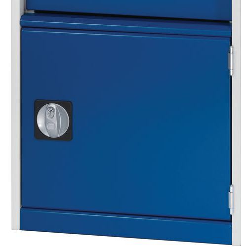Bott Cubio fiókos szekrények 75 kg-os teherbírású és 100%-os görgőscsapágyakkal bővíthető fiókokkal. Szekrényajtó perforált belső oldallal a szerszámok tárolására. Magas hegesztett acél konstrukció akár 1,5 tonna teherbírással, porszórt bevonattal befejezni. Központi zárrendszerű zár és egyidejűleg több fiók nyitásának blokkolása. Ergonomikus fogantyúk írható csíkkal, zárás hengeres zárral, két kulccsal.