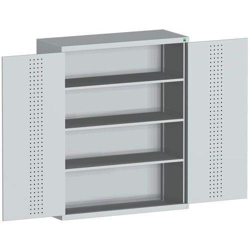 Fém műhelyszekrények polcokkal, 160 kg teherbírással. Megerősített szárnyas ajtók perforált belső oldallal a szerszámok tárolására. Magas hegesztett acél konstrukció akár 1,5 tonna teherbírással, porszórt felülettel. Zárás központi zárral hengerzár két kulccsal. . 25 mm-es lépésekben állítható magasságú horganyzott polcok.
