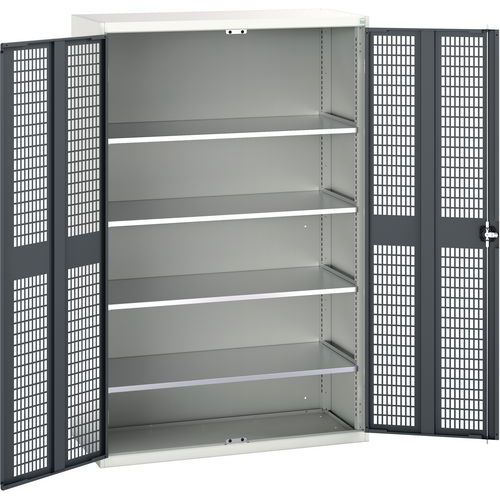 Fém műhelyszekrények drótajtókkal a jó szellőzés és a tartalom átláthatósága érdekében. A 75 kg teherbírású horganyzott polcok magassága 25 mm-es lépésekben állítható. Hegesztett acélszerkezet, porszórt felületkezelés. Hárompontos zárás hengereltolásos zár.